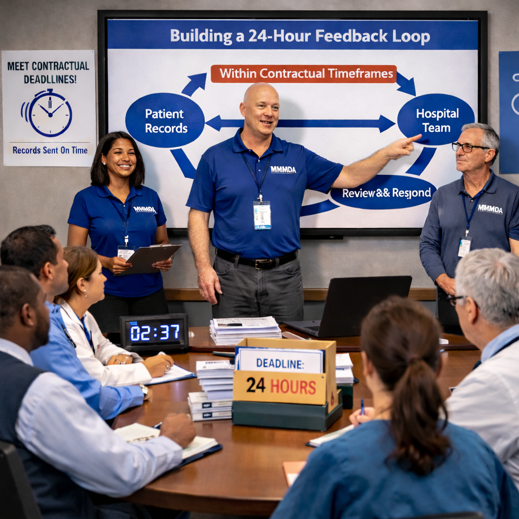 Provide strategic guidance to hospital teams to design and implement communication systems that create a 24-hour feedback loop between centralized UM and authorization teams, ensuring records are sent within contractual timeframes.